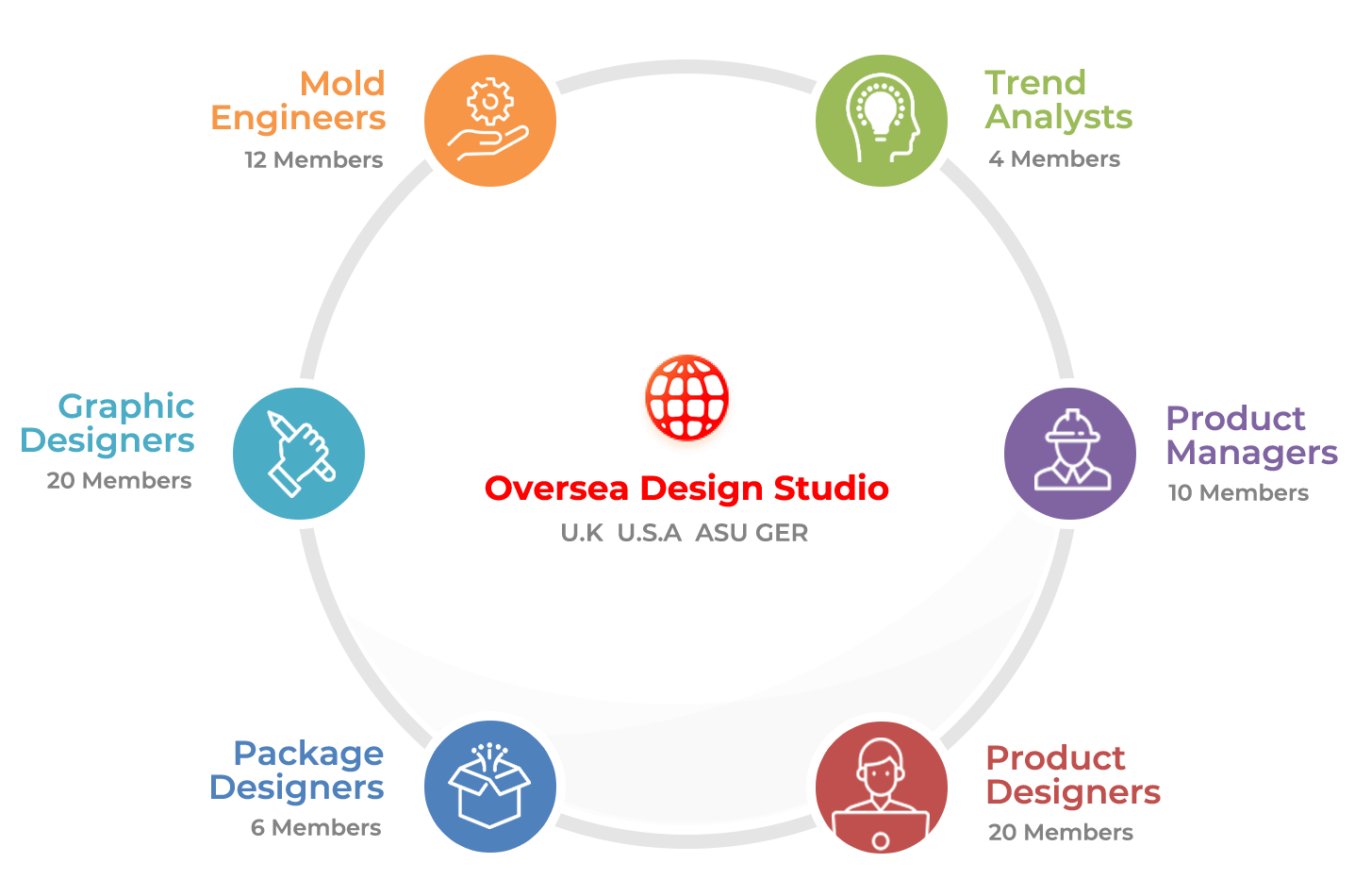 Our R&D team consists of 72 members, most of them have more than 10 years of experience, and we regularly organize professional skills training. We keep very close cooperation with design companies in Europe and Australia to create innovative products with ergonomics, function of utility model and keeping up with market trends.