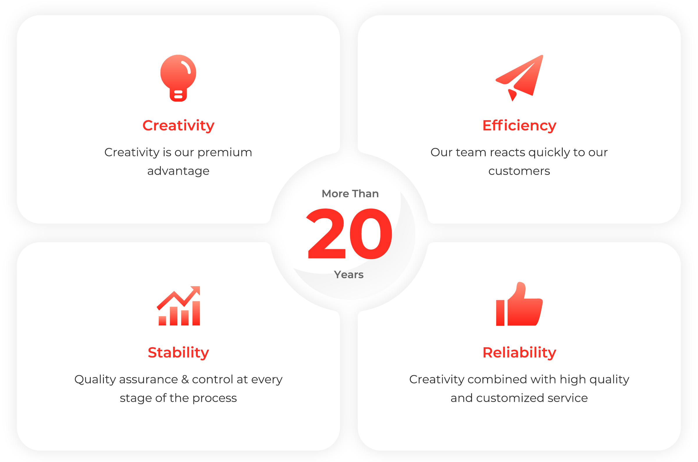 Creativity combined with high quality and customized service makes us your reliable supplier and we always grow up with our customers.